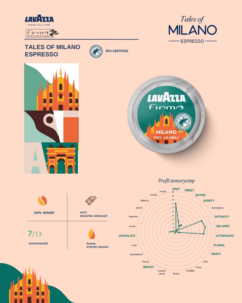 Opowieści z Mediolanu odzwierciedlają styl i innowacyjność miasta, łącząc gładką czekoladę i nuty suszonych owoców, aby uzyskać elegancki efekt. Odkryj piękno stolicy mody dzięki tej 100% Arabice pochodzącej z farm certyfikowanych przez Rainforest Alliance, która łączy w sobie intensywny smak i pełne body z delikatnymi aromatami mytej arabiki.